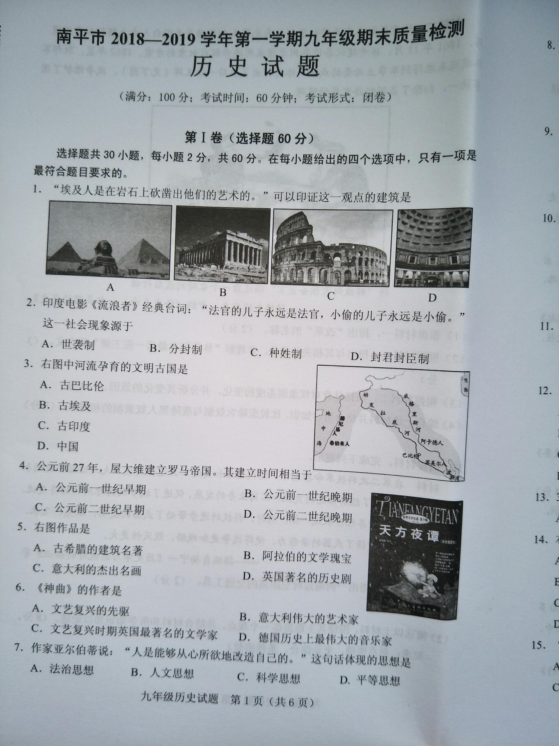 【摘要】福建省南平市2018-2019學年第一學期九年級歷史期末試題!更多中考信息可關注閩州教育中考資訊專欄。
