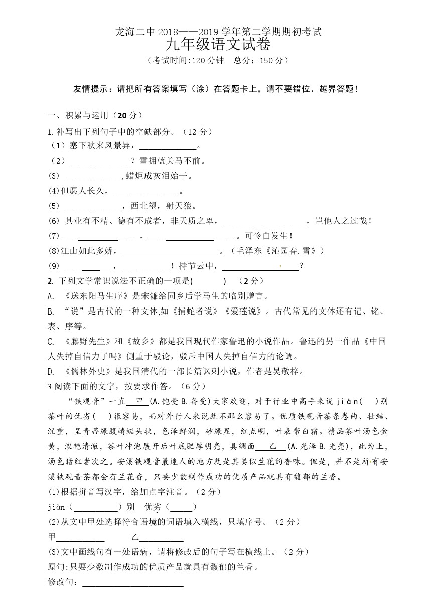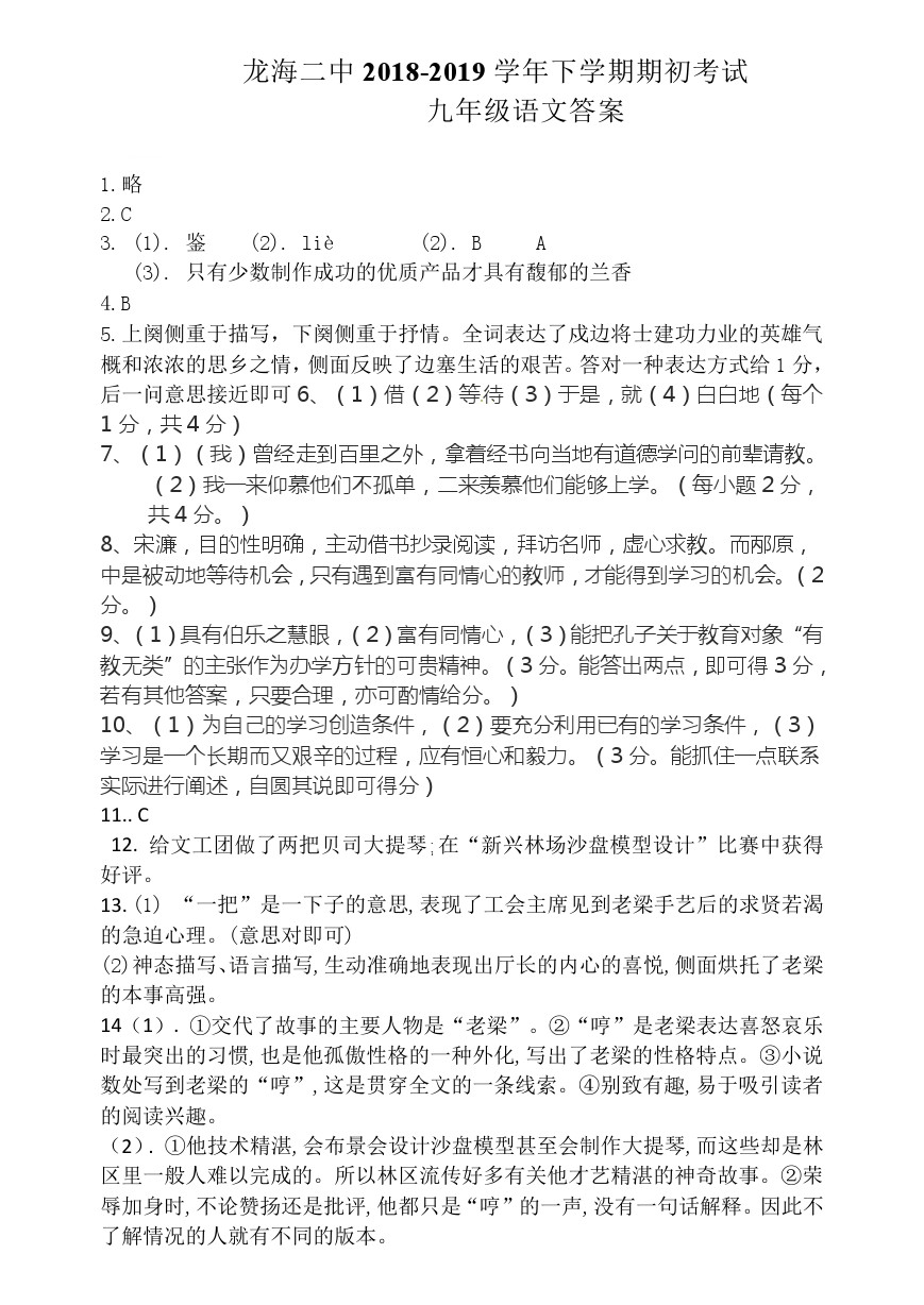 【摘要】福建省龍海市第二中學2019屆九年級下學期期初考試語文試題及答案,同學們可以針對題目更好的復習!更多中考信息可關(guān)注閩州教育中考資訊專欄。