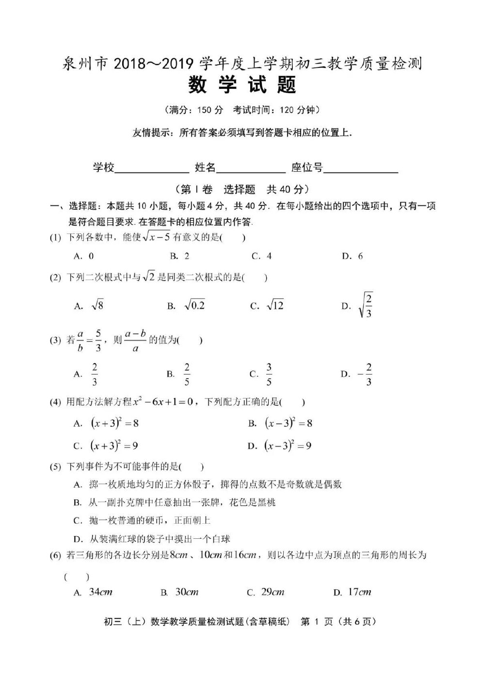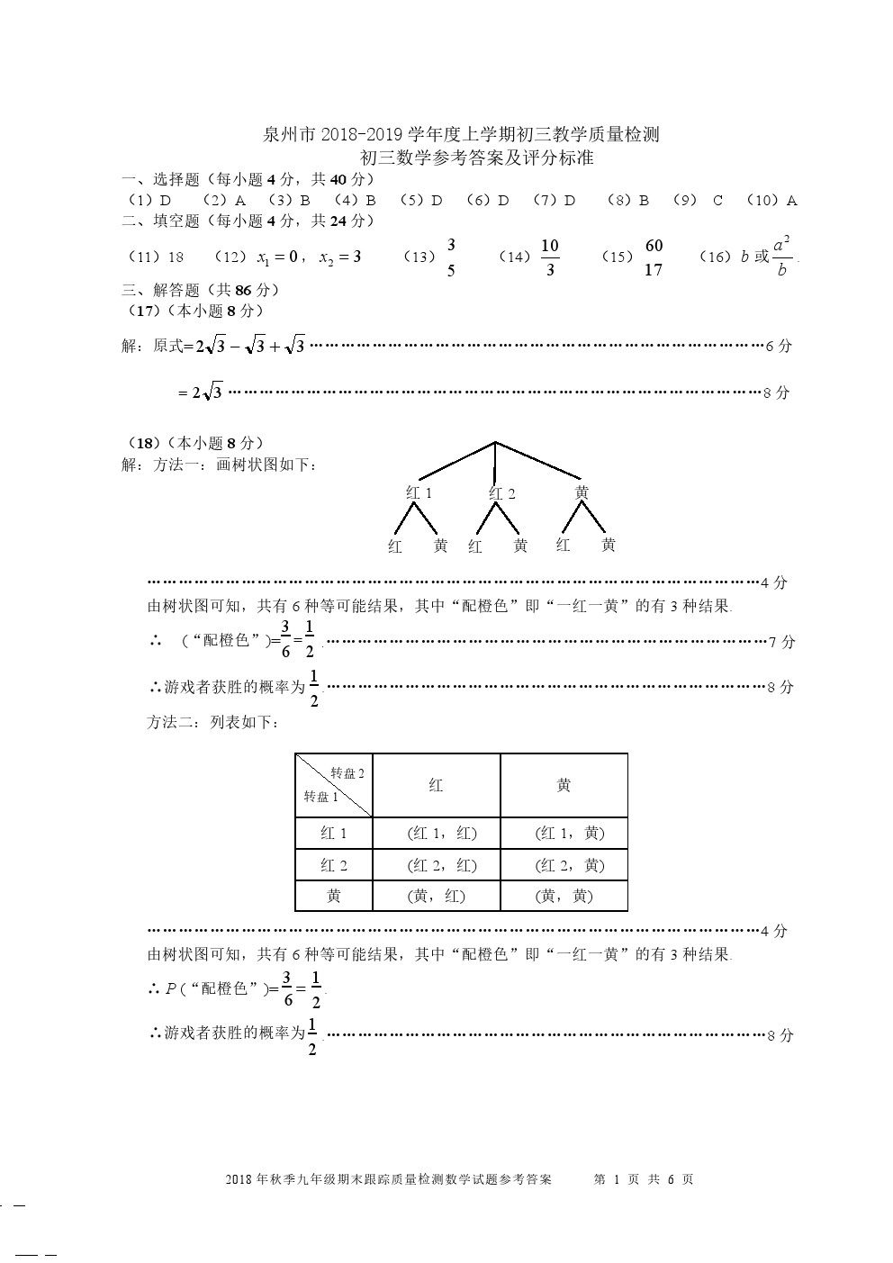 【摘要】福建省泉州市2018-2019學(xué)年度上學(xué)期初三期末質(zhì)檢數(shù)學(xué)試題及答案!更多中考信息可關(guān)注閩州教育中考資訊專欄。