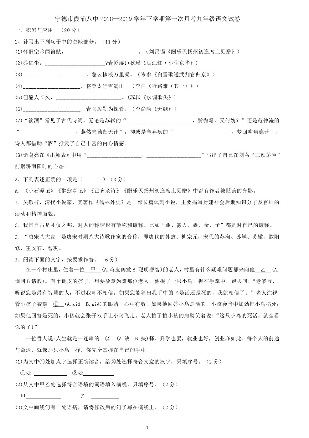 【摘要】福建省寧德市霞浦八中2019學(xué)年下學(xué)期第一次月考九年級語文試題。更多中考信息可關(guān)注閩州教育中考資訊專欄。