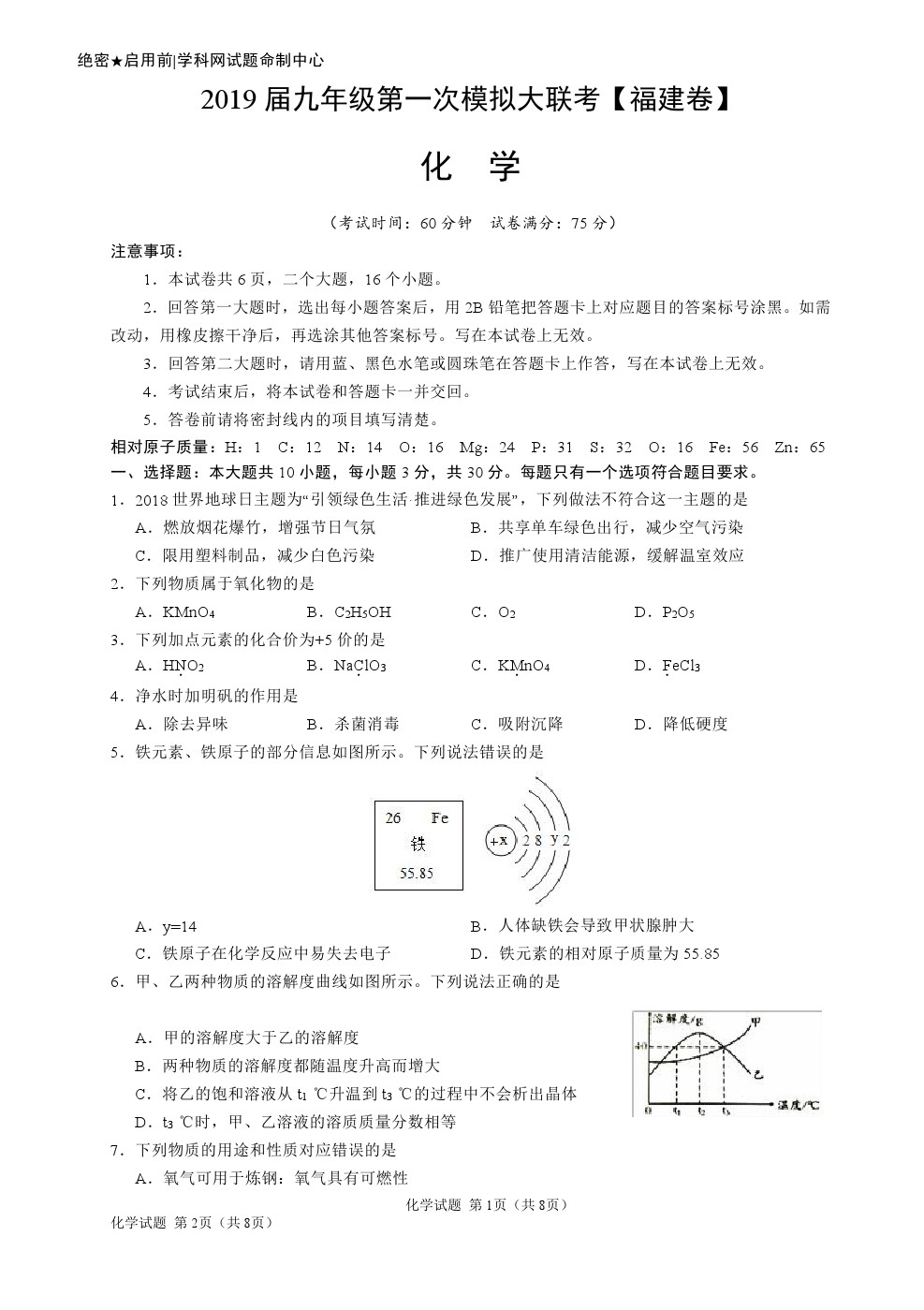 【摘要】2019屆3月九年級(jí)第一次模擬大聯(lián)考(福建卷)化學(xué)卷!更多中考信息可關(guān)注閩州教育中考資訊專欄。