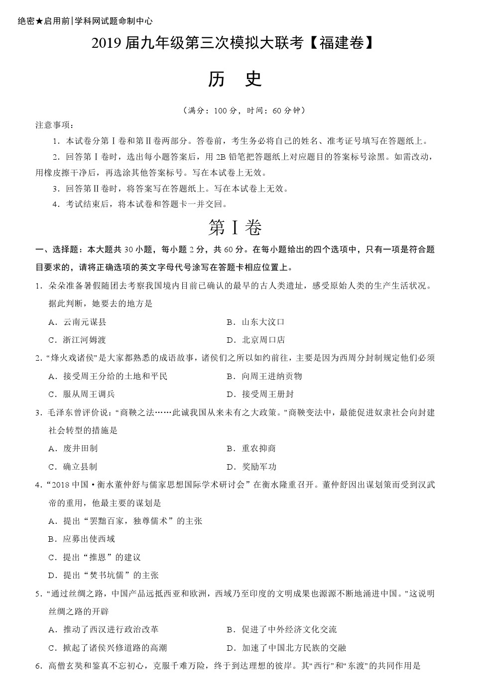 【摘要】2019屆九年級第三次模擬大聯考(福建卷)歷史試題!更多中考信息可關注閩州教育中考資訊專欄。