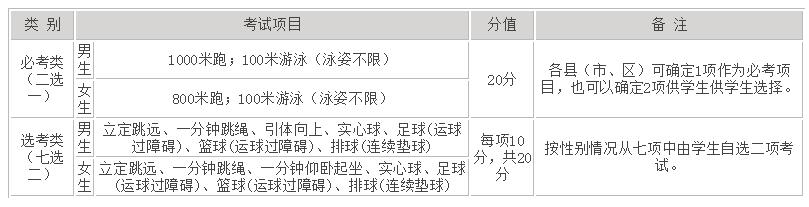 中考體育考試內(nèi)容分為身體素質(zhì)和運動技能測試兩個方面。龍巖中考體育必考類分值為20分,為二選一,其中,男生從1000米跑和100米游泳(泳姿不限)兩項中選擇一項,女生從800米跑和100米游泳(泳姿不限)中選擇一項。龍巖中考體育選考類按性別情況從七項中由學生自選二項考試,其中每項10分,共20分。
