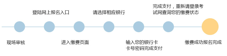 現(xiàn)場(chǎng)審核——登陸網(wǎng)上報(bào)名入口——進(jìn)入繳費(fèi)頁(yè)面——請(qǐng)選擇相應(yīng)銀行——輸入您的銀行卡卡號(hào)密碼完成支付——完成支付,重新登錄考試網(wǎng)查詢您的繳費(fèi)狀態(tài)——繳費(fèi)成功報(bào)名完成。