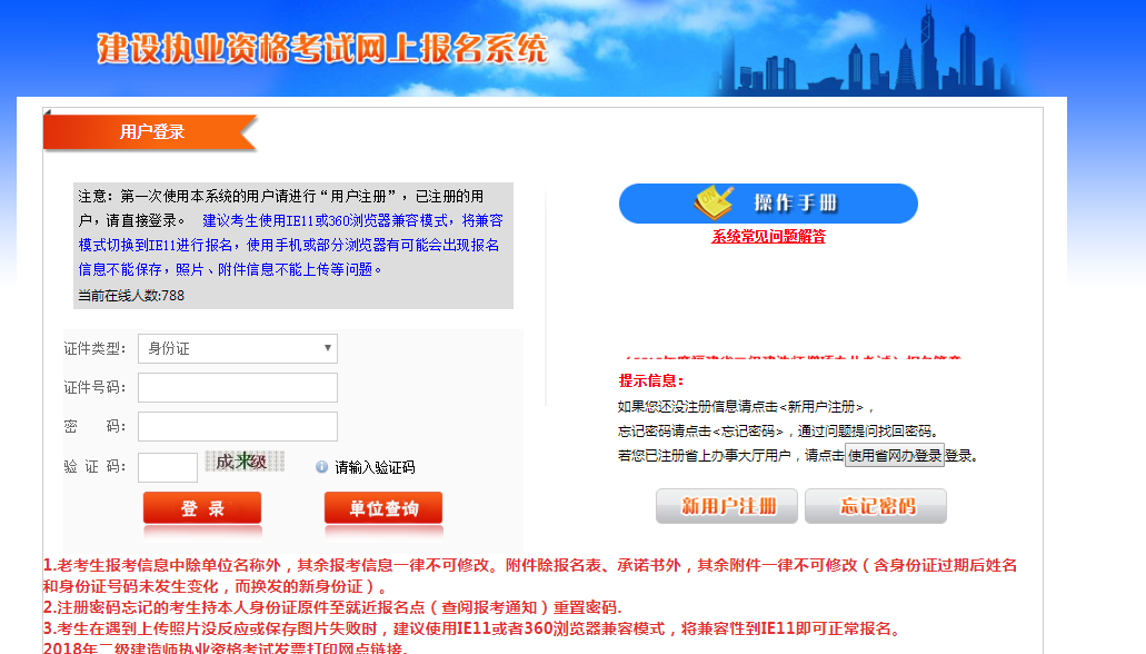 1.2019年2月15日至3月8日為報(bào)名時(shí)間,報(bào)考人員應(yīng)在報(bào)名時(shí)間內(nèi)登錄福建省建設(shè)執(zhí)業(yè)資格考試網(wǎng)上報(bào)名系統(tǒng)(網(wǎng)址:http://www.fjjszczx.org:8088/jwwsks/web/kszc/login.jsp,以下簡(jiǎn)稱(chēng)“網(wǎng)上報(bào)名系統(tǒng)”)進(jìn)行網(wǎng)上報(bào)名,報(bào)名時(shí)必須準(zhǔn)確填寫(xiě)個(gè)人聯(lián)系信息;3月9日至14日只接受已報(bào)名但未審核通過(guò)的報(bào)考人員修改信息,不再接受新的報(bào)名;3月15日起,報(bào)考人員只可進(jìn)行報(bào)考信息查詢。請(qǐng)所有報(bào)考人員務(wù)必合理安排好報(bào)名時(shí)間,認(rèn)真完成報(bào)名相關(guān)事項(xiàng)。