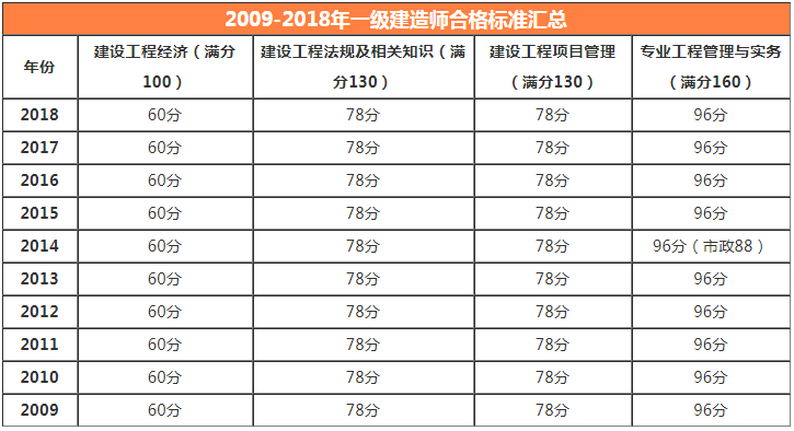 2009至2018年一級建造師合格標(biāo)準(zhǔn)匯總