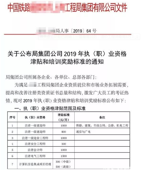 從某鐵路建設(shè)公司了解,根據(jù)一級(jí)建造師等證書有一系列的補(bǔ)貼措施。而且從這份文件可以看出:該集團(tuán)公司為了激發(fā)廣大員工考證熱情,制定了一系列獎(jiǎng)勵(lì)標(biāo)準(zhǔn),其中注冊(cè)一級(jí)造價(jià)工程師獎(jiǎng)勵(lì)4萬,注冊(cè)一級(jí)建造師中的建筑、公路、機(jī)電、通信均一次性獎(jiǎng)勵(lì)6萬,而一級(jí)市政獎(jiǎng)勵(lì)則達(dá)到了10萬元!這也是近幾年來一級(jí)建造師公開獎(jiǎng)勵(lì)歷史之最!